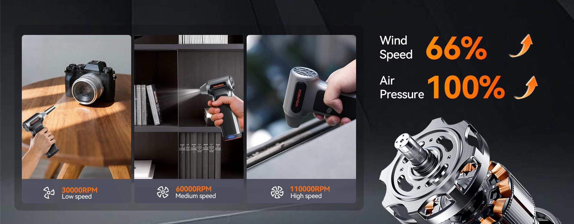 TDieser Druckluftbläser erreicht bis zu 110.000 U/min mit einer maximalen Luftstromgeschwindigkeit von über 190+MPH und entfernt effektiv Staub und Schmutz.Drei einstellbare Geschwindigkeiten