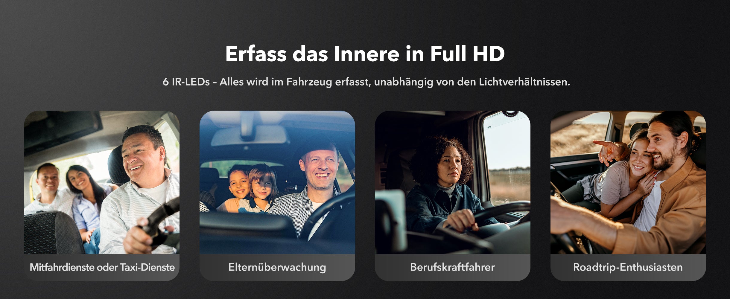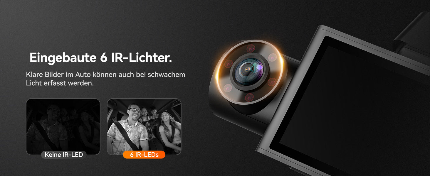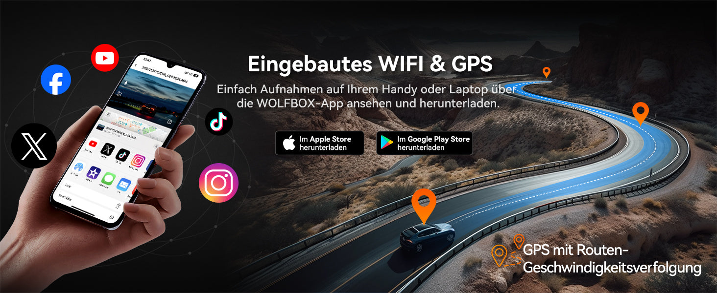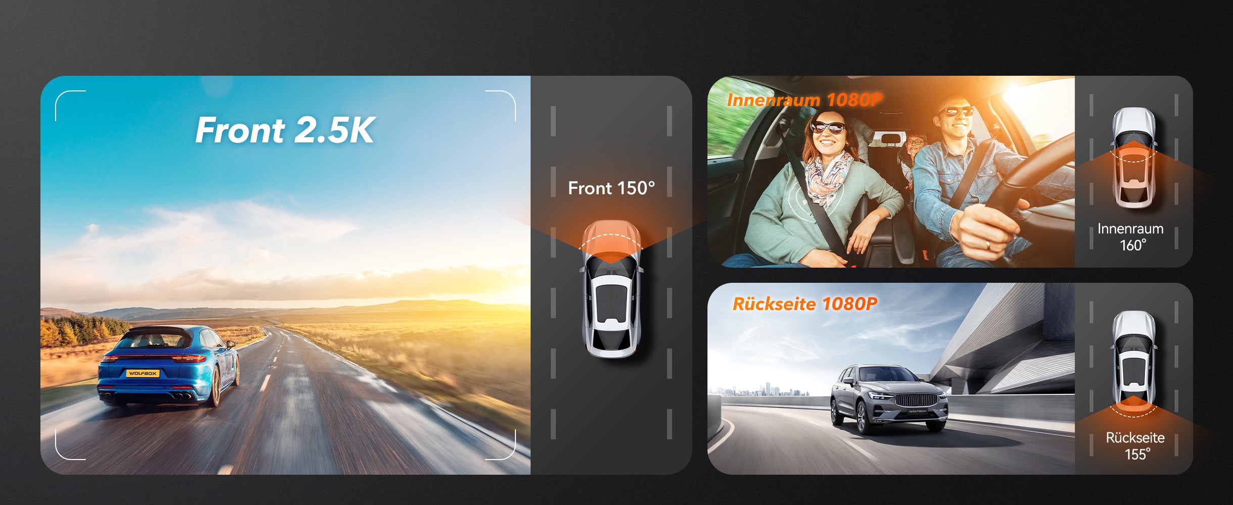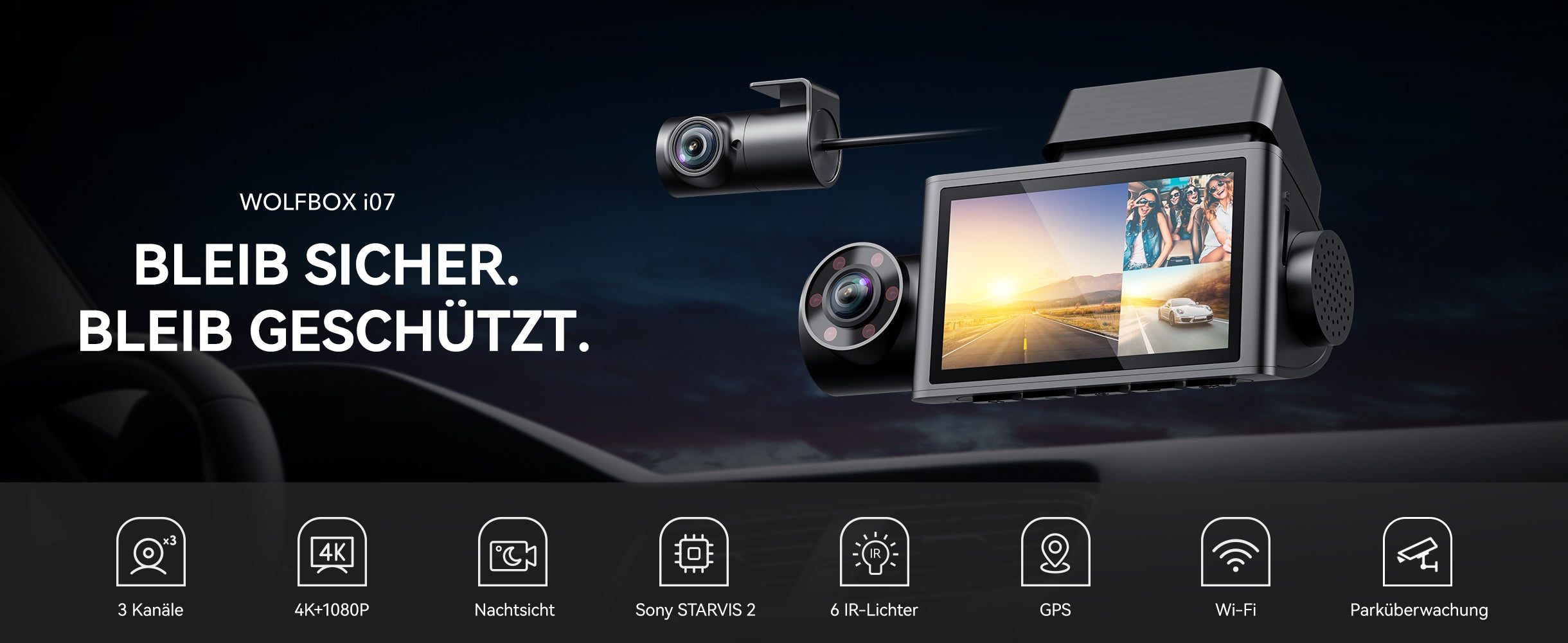 Die WOLFBOX i07 Dashcam mit WLAN und 3-Kanal-Funktion ermöglicht einfachen Zugriff auf aufgezeichnete Aufnahmen und erfasst Videos aus mehreren Blickwinkeln für mehr Sicherheit.