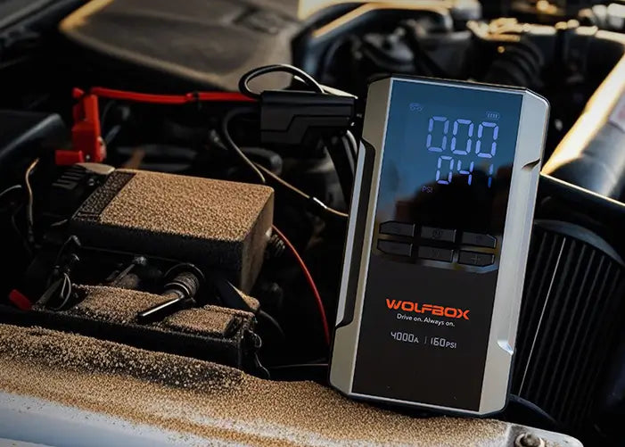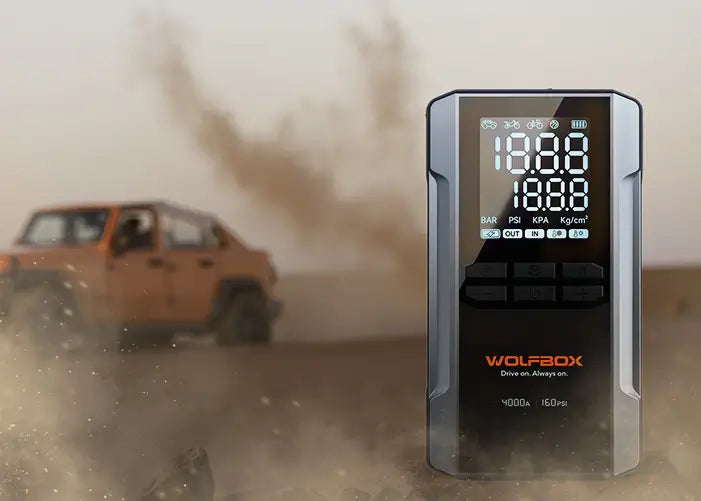 Der WOLFBOX 4-in-1 Starthilfe- und Luftkompressor vereint Starthilfe, Reifenaufpumpen, Schnellladen und Notbeleuchtung in einem tragbaren Gerät.