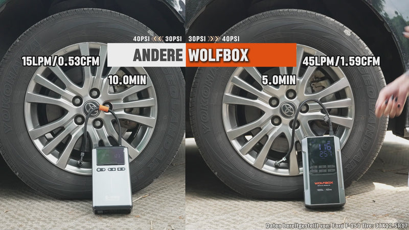 Nach vollständiger Aufladung kann der WOLFBOX MegaVolt 24Air Zwei-in-Eins Starthilfe- und Luftkompressor je nach Fahrzeugtyp und Batteriezustand bis zu 40 Mal Starthilfe leisten.