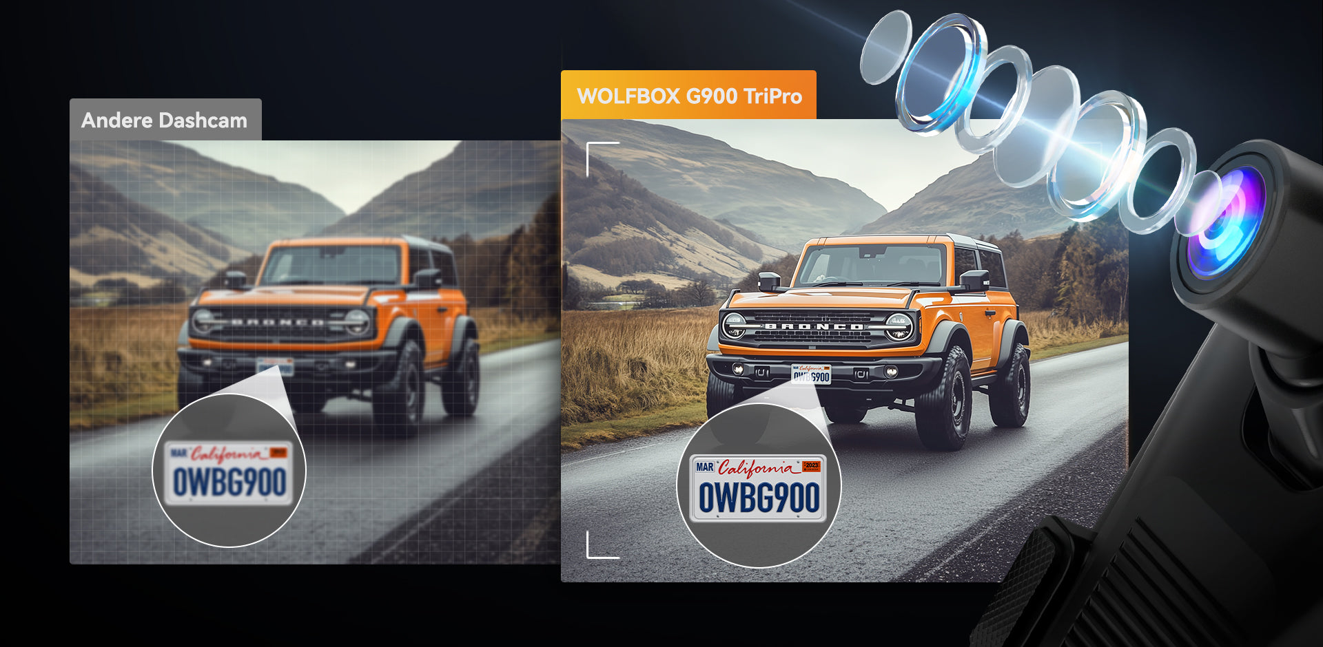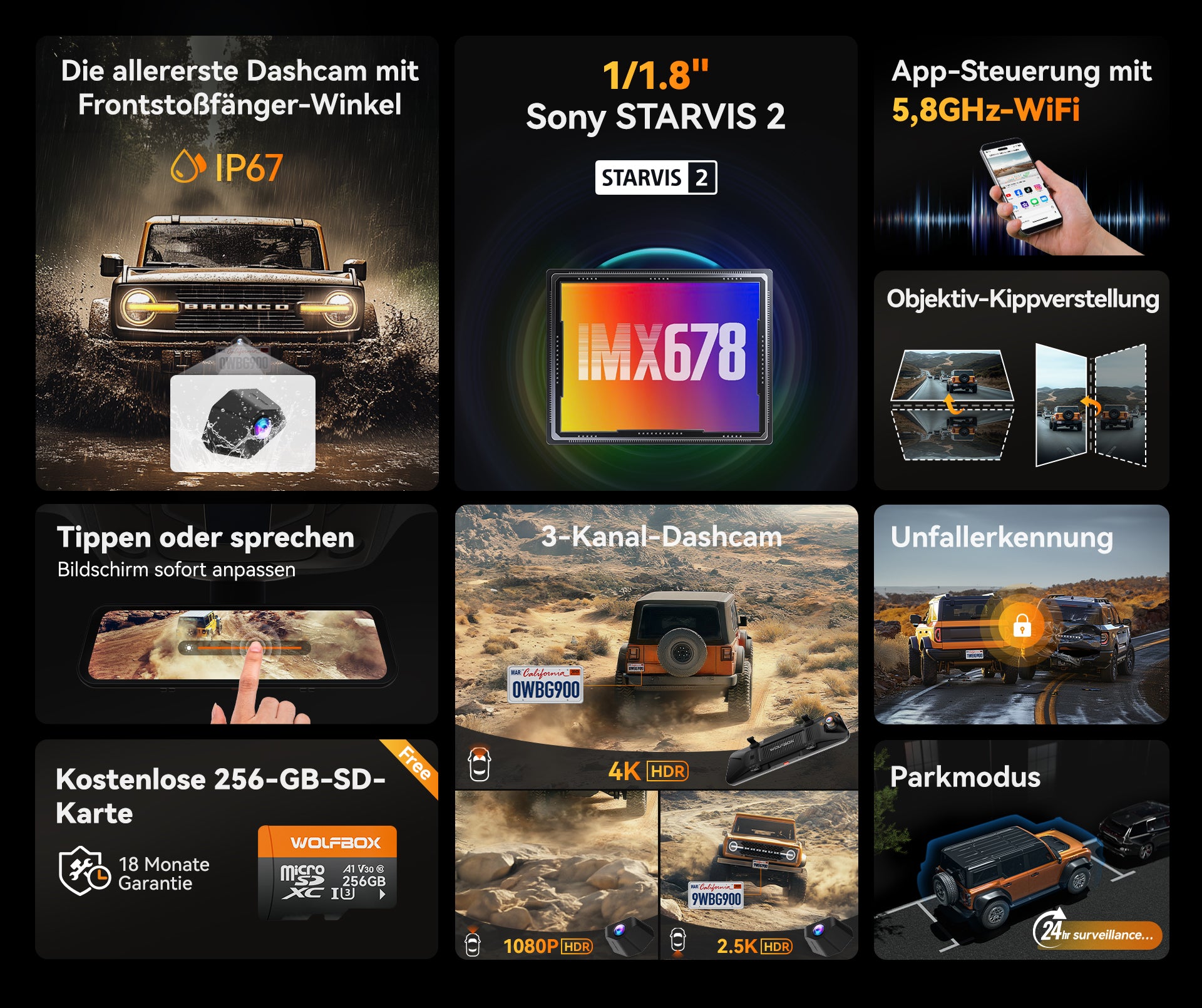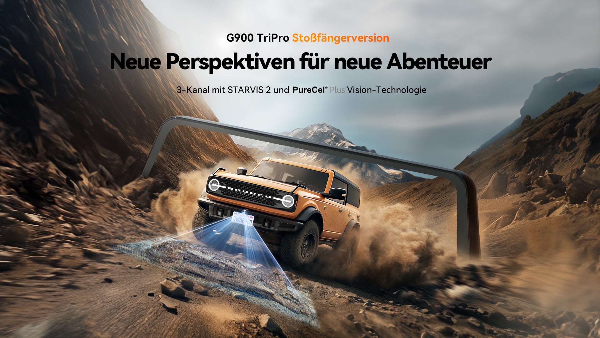 - Die G900 TriPro, geboren für Offroad-Abenteuer, bringt die erste Frontstoßfänger-Kamera der Branche auf den Markt, die Ihnen hilft, Hindernisse mühelos zu erkennen und jede unbekannte Straße zu erobern.