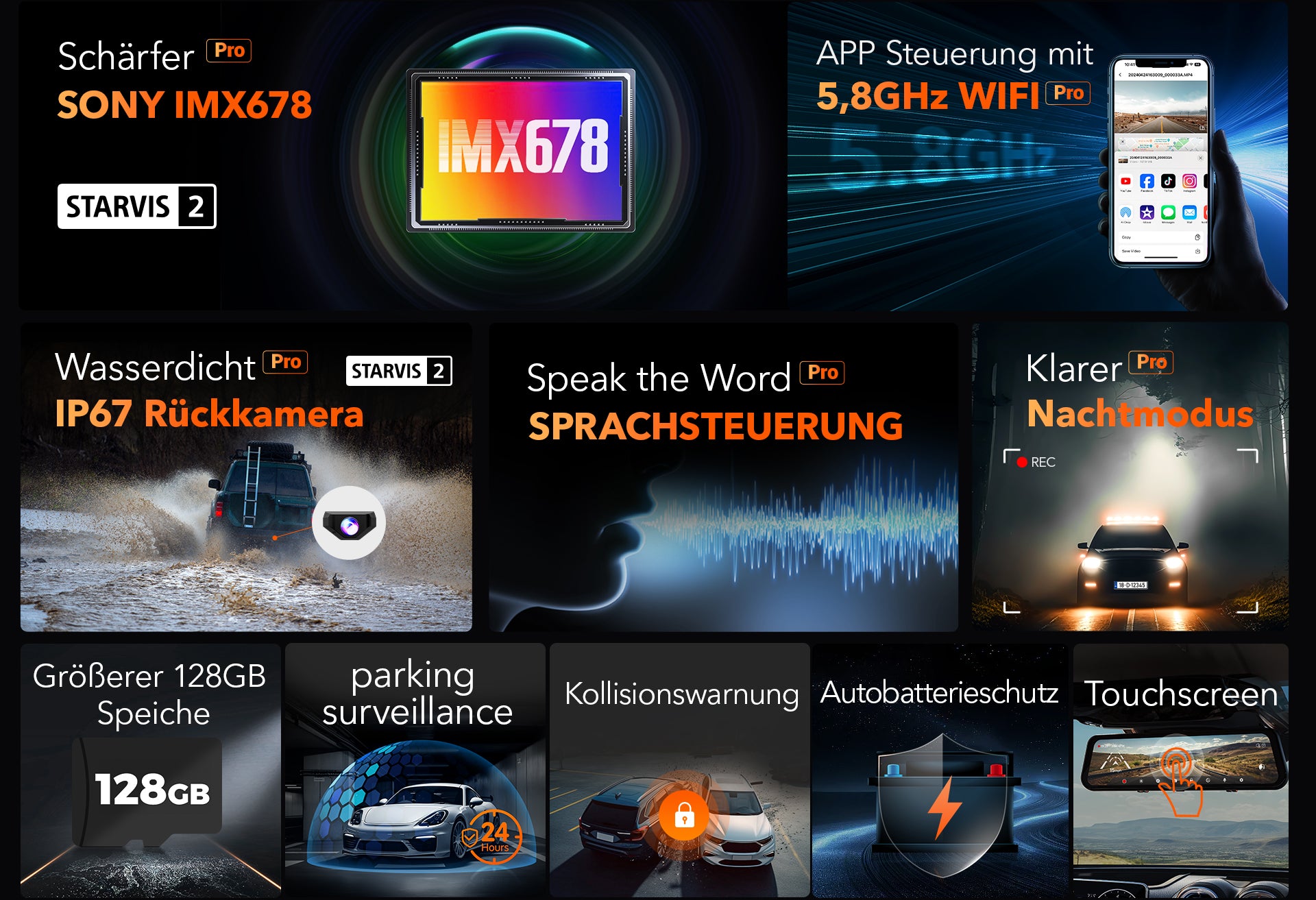 - Ungehinderte Dual-ViewWechseln Sie nahtlos zwischen Front- und Rückkamera oder dem Split-Screen-Modus, um eine umfassende und klare Sicht auf Ihre Umgebung zu gewährleisten.